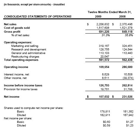 For the full fiscal year, sales were $2.2 billion, down from $2.4 billion in FY 2008. Operating income was $110 million, down from $287 million a year ago. Net income was $107 million ($0.59 per share) compared to net income of $231 million ($1.23 per share) in the prior year. Excluding restructuring charges, net income was $128 million ($0.69 per share). Gross margin for FY 2009 was 31.3 percent compared to 35.8 percent in FY 2008.