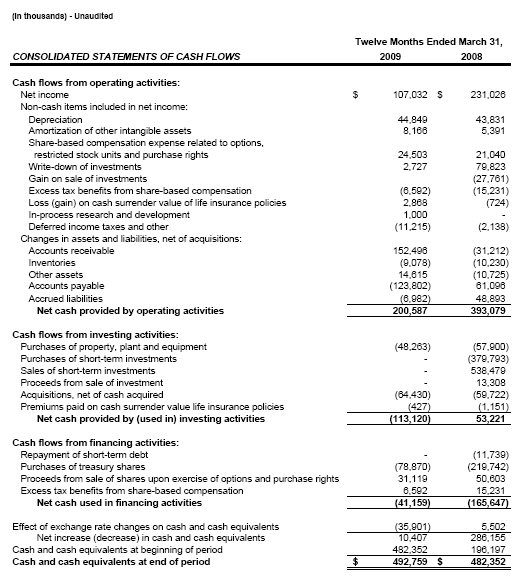 "During Q4 we achieved more than a $100 million reduction in our inventory on a sequential basis. I am also very pleased with our cash management during the quarter. We exited Fiscal Year 2009 with approximately a half billion dollars in cash, up sequentially, and virtually unchanged year over year, in spite of the turmoil in the global economy during the period.