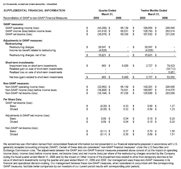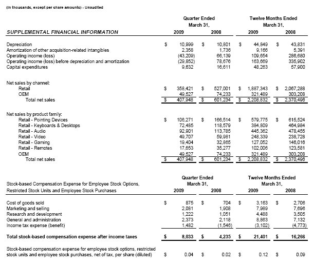 Sales for Q4 were $408 million, a decrease of 32 percent compared to $601 million in the same quarter last year. The Company posted an operating loss of $43 million, compared to operating income of $66 million in the same quarter a year ago. The net loss for Q4 was $35 million ($0.20 per share) compared to net income of $60.3 million ($0.32 per share) in Q4 FY 2008. During the fourth quarter, Logitech recorded pre-tax restructuring charges of $20.5 million ($15.9 million after tax or $0.09 per diluted share). Gross margin for Q4 was 25.0 percent compared to 35.6 in Q4 FY 2008.